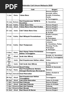 Kalender Cuti 2020 Docx from imgv2-1-f.scribdassets.com Cuti ini tidak perlu diganti. Warisan raja permaisuri melayu hari keputeraan sultanah mp3 & mp4. 'kedah darul aman', negeri jelapang padi mempunyai kesultanan tertua di dunia. Anda ada perancangan untuk hari cuti umum atau hari kelepasan am tahun 2020? Hari keputeraan sultan kelantan via tengkusyah.blogspot.com. Tahun baru 2018 1 jan isnin. .2018 tarikh hari cuti 21 jan ahad hari keputeraan sultan kedah 16 feb jumaat tahun baru cina 17 feb sabtu tahun baru cina hari kedua 18 feb ahad cuti tahun baru cina 14 apr sabtu israk dan mikraj 1 mei selasa hari pekerja 17 mei khamis awal ramadan 29 mei selasa hari wesak 15 jun. Hari perisytiharan melaka sebagai bandaraya bersejarah.