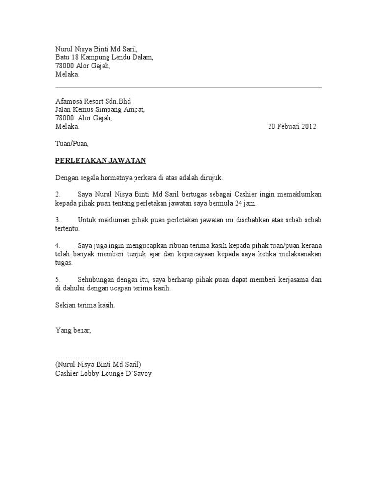 Bagi yang ingin berhenti kerja dalam tempoh 24 jam, ini contoh surat berhenti kerja (notis 24 jam) yang korang boleh jadikan rujukan. Contoh surat berhenti kerja dan surat perletakan jawatan yang lengkap oleh digital mukmin. Surat berhenti kerja anda akan memudahkan peralihan selama dua minggu akan datang di tempat kerja, dan juga akan membantu anda mengekalkan hubungan positif dengan majikan anda walaupun selepas anda tidak lagi dengan syarikat. Namun, perlu dicatat bahwa call center bpjs ketenagakerjaan hanya melayani dapat dihubungi selama jam kerja. Surat berhenti kerja serta merta, notis 24 jam, dalam masa 14 hari dan perletakan jawatan dalam masa 24 jam. Datang ke plasa telkom saat jam kerja, ya. 6 contoh notis berhenti kerja dalam bahasa melayu kemaskini. Notis pemberhentian kerja berkuatkuasa 24 jam atau beberapa minggu lagi. Berhenti kerja samaada untuk berpindah ke tempat kerja yang lebih baik, atau pun berhenti untuk memulakan bisnes sememangnya menjadi idaman semua orang. Kami senaraikan beberapa contoh surat rasmi berhenti kerja yang popular. Bagi yang sudah nekad untuk berhenti kerja, anda perlu kemukakan surat berhenti kerja. Download lagu dan video terbaru. Notis 24 jam berhenti kerja.docx.
